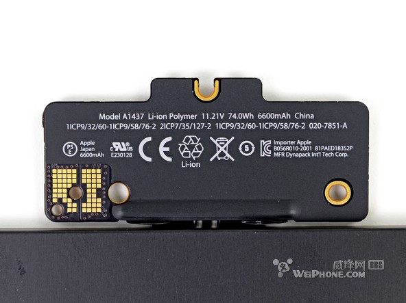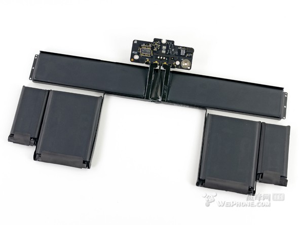 整塊電池一共由 6 個電池單元組成,整體看上去就像一個衣架。和 15 英寸 Retina Macbook Pro 的電池設計相比,“衣架”風格的設計為 13 英寸 Retina Macbook Pro 的內部節省了許多空間。