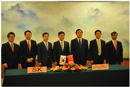 6月28日,在韓國總統樸槿惠訪華期間,中國石化集團公司總經理王天普與SK集團副會長具滋榮在北京釣魚臺國賓館簽署了武漢乙烯項目合資經營合同。韓國產業通商資源部部長尹相直出席簽約儀式。雙方將待中國商務部批準后成立合資公司,中國石化與SK綜合化學的股比為65:35,預計最快今年下半年武漢乙烯項目投入商業運營。