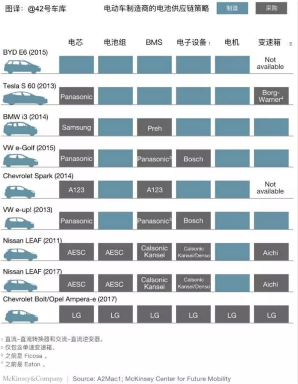 特斯拉和比亞迪在動力總成的垂直一體化上完成度是最高的,而通用則是采用了所有零部件都外包的策略,廠家的不同策略影響了傳統供應商的競爭定位。