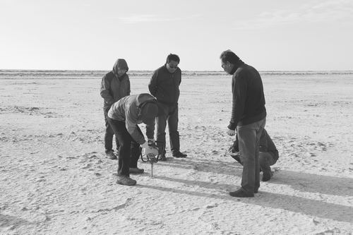 ③隊(duì)員們在新疆瑪納斯鹽湖上使用背包鉆鉆探。