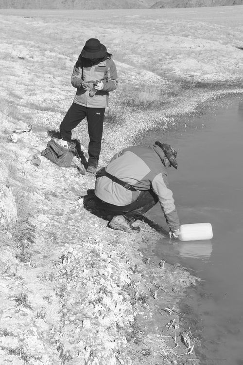 ②在甘肅高臺(tái)鹽池進(jìn)行野外采樣及溫度電導(dǎo)率pH 值測量。