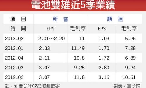 由于順達下半年單顆電池芯占整體出貨比重將突破5成,毛利率難以向上,而且大陸電池芯廠商受電池芯價格持續下滑,切入電池模塊轉為積極,臺系模塊廠殺價壓力大。元大投顧預估,2013年順達全年毛利率約6.2%,全年EPS為5.81元,比2012年的10.26元,接近腰斬。順達第2季財報欠佳,單季每股稅后盈余為1.03元,為金融海嘯以來的新低,導致昨日股價重挫,一度被打入跌停,收77.8元,并拖累同業股價,加百裕(3323)盤中跌停,終場重挫5.81%,新普也跌掉半根停板,收125元。