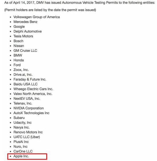 2017年4月,加州的機動車管理局(DMV)批準蘋果在公共道路上測試自動駕駛汽車。以下是在加州測試自動駕駛汽車的公司名單: