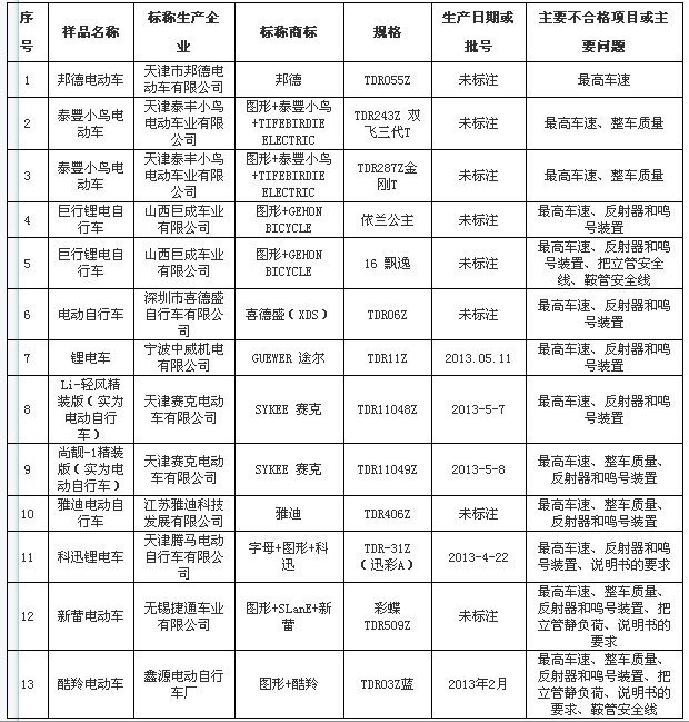 監測結果顯示,邦德牌TDR055Z、泰豐小鳥牌TDR243Z 雙飛三代T等13個型號總體判定為不合格,主要為最高車速、整車質量、反射器和鳴號裝置、說明書的要求等項目不符合國家標準要求。具體名單如下: