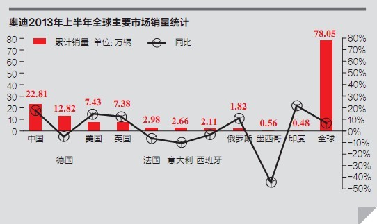 2013年上半年,奧迪中國市場銷量為22.8萬輛,增長17.7%。不僅保持了中國豪華車市場領軍者的地位,而且前進步伐比競爭對手更快——寶馬2013年上半年銷量同比增長15%,奔馳則為負增長。
