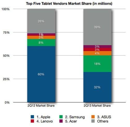 整個市場上只有iPad在走下坡路,老對手如三星和Nexus7市場份額均穩步提升,但是iPad表現最搶眼的對手是一家叫“Others”的平板電腦“制造商”。圖中的“Others”主要由中國的小規模Android平板廠商構成,他們生產了將近四成的平板電腦。這些廠商大多數聚集在深圳,主打千元以下平板,面向國內三線以下城市和其他發展中國家。