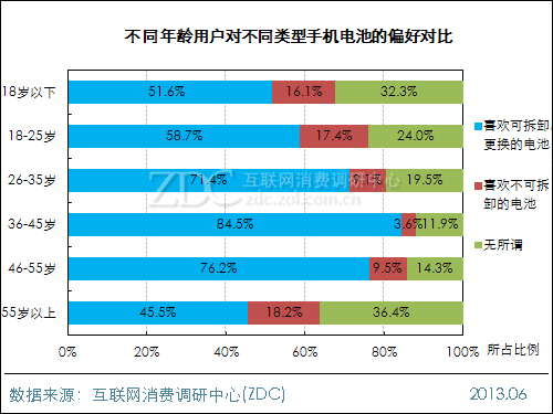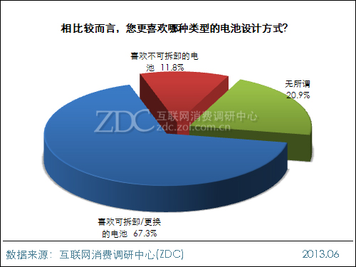 ZDC 調(diào)查數(shù)據(jù)顯示,參與調(diào)查的近千名中國IT網(wǎng)民中,七成用戶所使用的手機(jī)電池為可拆卸、可更換型,同時在偏好程度的選擇上,67.3%的IT網(wǎng)民表示喜歡可 拆卸、可更換電池的手機(jī),有超一成的IT網(wǎng)民明確表示不喜歡不可拆卸/更換電池的手機(jī)。另有兩成網(wǎng)民對手機(jī)電池是否可拆卸/更換表示無所謂。