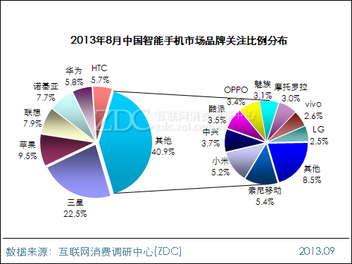 (圖) 2013年8月中國智能手機市場品牌關注比例分布