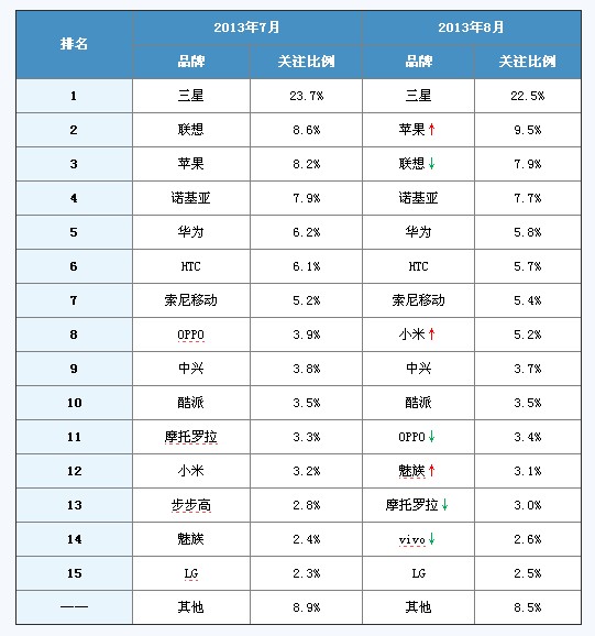 表  2013年7-8月中國智能手機市場品牌關注比例對比