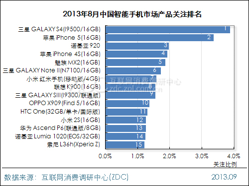 (圖) 2013年8月中國智能手機市場產品關注排名