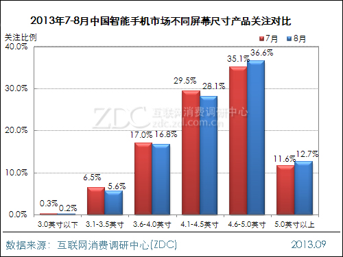 (圖) 2013年7-8月中國智能手機市場不同屏幕尺寸產品關注對比