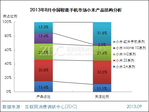 (圖) 2013年8月中國智能手機市場小米產品結構分析
