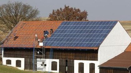 在蘭茨胡特市附近的一個農莊,工人在屋頂上安裝320平方米的太陽能電池板。圖片來源/路透社
