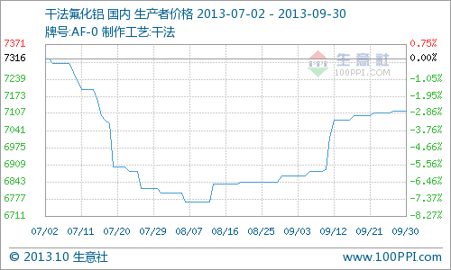 據生意社大宗榜數據顯示,9月干法氟化鋁市場價格上漲,截至月末國內出廠價格在7116元/噸,較月初價格6866元/噸上漲3.64%。,當前價格同比去年下降了5.95%,市場主流報價為7000-7200元/噸。