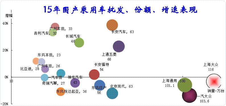 15年的合資主力廠家走勢壓力較大,主力車企面臨負增長,而長安、吉利的銷量增速高增長。15年江淮、長安汽車和吉利汽車的走勢較好,這體現了自主逐步恢復活力。