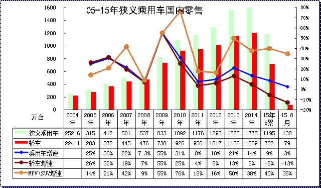 根據(jù)全國乘聯(lián)會數(shù)據(jù),2014年累計(jì)國內(nèi)狹義乘用車綜合零售銷量1775萬臺,增速為14%。15年車市零售開局走強(qiáng)有春節(jié)支撐,1-8月零售1195萬臺,同比增9%。8月的中國狹義乘用車綜合零售銷量138萬臺,增速為3%。15年8月的狹義乘用車仍是多功能車高增長,轎車低迷。