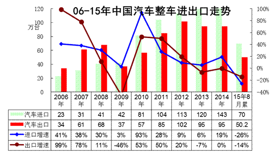 根據(jù)全國海關(guān)統(tǒng)計(jì),2015年1-7月的中國汽車?yán)塾?jì)進(jìn)口63萬臺,累計(jì)增速-24%。總體看今年的進(jìn)出口累計(jì)增速走勢均有下滑,進(jìn)口增速下滑到-24%,出口下降到-11%。今年進(jìn)口車的波動遠(yuǎn)大于出口市場,今年的進(jìn)口受傷就很嚴(yán)重。但出口的壓力也在急劇增大。