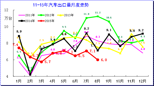 從月度走勢看,前兩年的出口仍呈現(xiàn)季節(jié)性特征,呈現(xiàn)夏季走高過山車的見頂回落走勢特征,但15年車市出口開局就出現(xiàn)高位下滑的局面。14年尚有走強(qiáng)向上的趨勢。15年的上半年出口量低迷。15年5月的汽車出口達(dá)到7.1萬的,隨后沒有出現(xiàn)夏季的攀升特征,8月仍處于7.1萬的歷史低位,風(fēng)險(xiǎn)巨大。