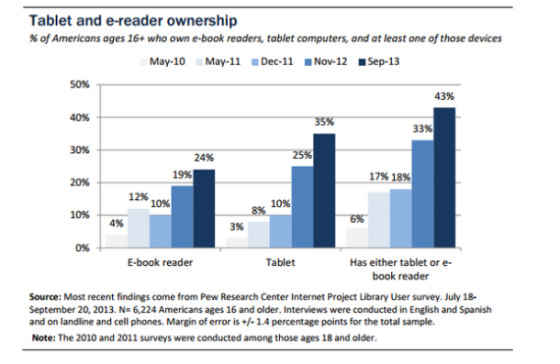 美國皮尤研究中心的最新報(bào)告顯示,今年9月約有35%的美國人擁有平板電腦,而擁有電子閱讀器的比例也達(dá)到24%。
