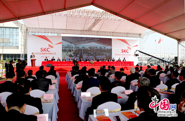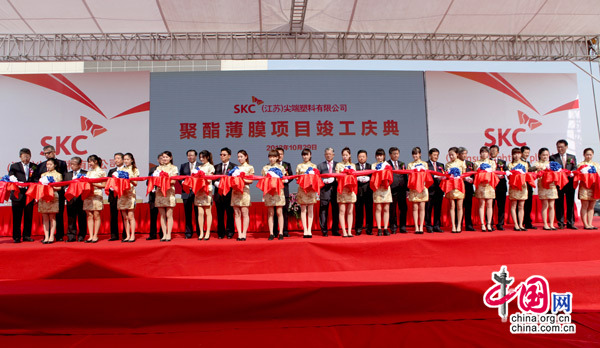 SKC(江蘇)尖端塑料有限公司竣工投產儀式10月29日在南通舉行。中國政協外事委員會副主任韓方明、上??傤I事具相璨、韓國SKC會長崔信源、社長樸長錫以及中韓兩國和日本的合作方代表300多人參加了儀式。攝影 姚衛民
