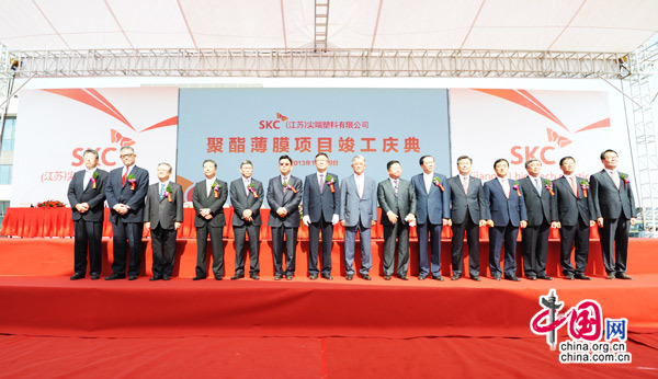 中國政協外事委員會副主任韓方明、上??傤I事具相璨、韓國SKC會長崔信源以及中韓兩國和日本的合作方代表300多人參加了SKC(江蘇)尖端塑料有限公司的竣工投產儀式。