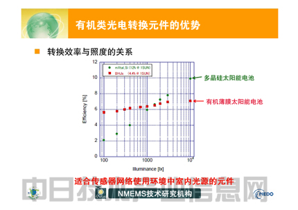 采用有機半導體的太陽能電池的發電效率已達到并不遜色于住宅及工業使用的非晶(多晶)硅型太陽能電池的水平。在目前已公開的產品中,有機半導體太陽能電池最高水平的效率為12%。在室內低于1000lux的照度條件下,其效率高于非晶硅太陽能電池等(圖2)。在室內環境中,有機薄膜太陽能電池在效率方面也十分有利。
