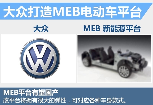 大眾將推出專為新能源車型研發(fā)的全新電動車模塊化MEB平臺,此平臺以現(xiàn)在擁有的機(jī)械架構(gòu)為基礎(chǔ),并且擁有較強(qiáng)的擴(kuò)展性,能夠同時滿足不同級別到不同類型的車在此平臺上得到使用。通過對不同電動車型續(xù)航里程的調(diào)校,可實(shí)現(xiàn)250至500公里不等的續(xù)航里程。另外此平臺有望進(jìn)行本土化,為中國消費(fèi)者提供不同的純電動車型選擇。
