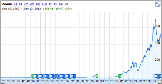 據(jù)國(guó)外媒體報(bào)道,蘋(píng)果于1980月12月12日首次公開(kāi)招股(IPO),發(fā)行價(jià)22美元,共計(jì)出售了460萬(wàn)股股票。這次IPO融資額度高于自1956年福特汽車(chē)(Ford Motor)上市以來(lái)任何一次IPO融資規(guī)模,并且當(dāng)時(shí)立即創(chuàng)造了300位百萬(wàn)富翁。