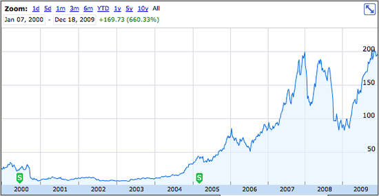2008年,蘋(píng)果的未來(lái)再次遭受分析人士的懷疑,擔(dān)心消費(fèi)者負(fù)買(mǎi)不起iPhone、iPod或Macintosh等蘋(píng)果的產(chǎn)品。不過(guò)事實(shí)證明這一切的憂慮是多余的,在2000年代的10年里蘋(píng)果股價(jià)再次增長(zhǎng)了660.33%。