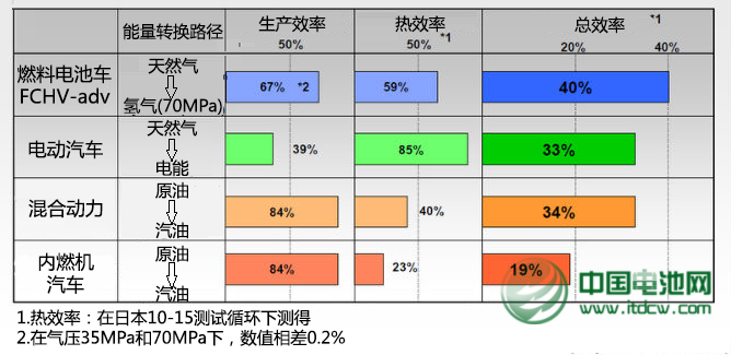 事實上是,電解水氫氣的過程確實需要耗費大量的能量,制造一千克的氫氣就要消耗50-60度電,在豐田的FCHV-adv車上能儲存6千克的氫氣。相比于汽油高達80%-85%的生產效率,氫氣的生產效率目前僅為50%-60%。不過隨著技術的進步,這一數字也會逐漸提高。更重要的是,雖然氫氣的生產效率低,但是其熱效率高,而最終的45%的總熱效率是電動汽車所不能比擬的。