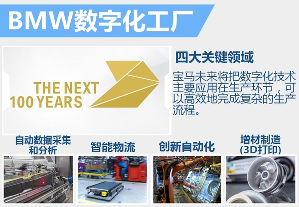 在智能化生產方面,未來寶馬集團將主要聚集于四個關鍵領域。首先自動數據采集和分析,通過全新3D工廠數據使精確規劃成為可能,并實現數字系統和結構與現有系統完美結合,進一步提高生產靈活性;另外智能化物流則為增強供應網絡的透明度,并進行優化;創新的自動化系統則能直接為員工的生產工作提供幫助,通過機器人等科技的加入減輕工作壓力;最后關于增材制造則是指3D打印技術的批量生產,為客戶定制車輛零部件和預留備件。