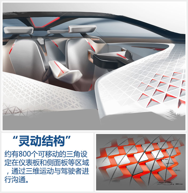 “BMW VISION NEXT 100”概念車應(yīng)用了名為“靈動結(jié)構(gòu)”的全新技術(shù),約有800個可移動的三角設(shè)定在儀表板和側(cè)面板等區(qū)域,通過三維運(yùn)動與駕駛者進(jìn)行溝通。全新技術(shù)可與平視顯示系統(tǒng)結(jié)合,將模擬和數(shù)字功能融合,利用不同的直觀信號,提前預(yù)知即將發(fā)生的情況。