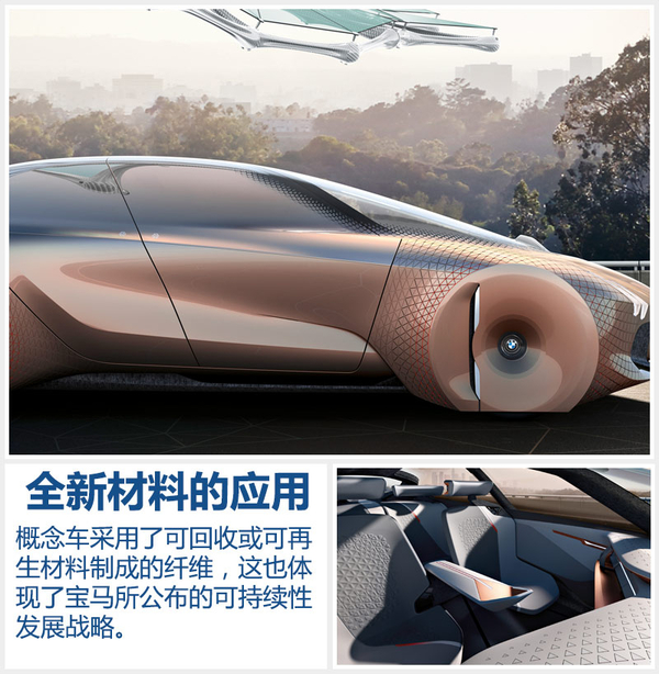 “BMW VISION NEXT 100”概念車另一項重要技術(shù)便是采用了可回收或可再生材料制成的纖維,這也體現(xiàn)了寶馬所公布的可持續(xù)性發(fā)展戰(zhàn)略。寶馬官方表示:未來,材料的選擇在整個設(shè)計和制造流程中會變得越來越重要。例如,新車側(cè)圍版便采用了由標(biāo)準(zhǔn)碳纖維生產(chǎn)中多余的材料制成,并將在未來研發(fā)更多新型環(huán)保材料。新車的內(nèi)飾用料全部采用高品質(zhì)的織物和易于回收的材料,取消了真皮內(nèi)飾減少使用木質(zhì)部件,整車更加迎合環(huán)保的理念。