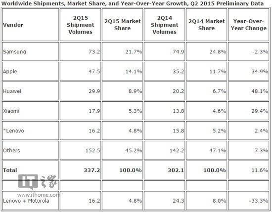 IDC數(shù)據(jù)顯示,2015二季度是有史以來出貨量最高的第二季度,智能手機(jī)廠商全球出貨量共計(jì)3.372億,同比去年3.021億增長高達(dá)11.6%。三星雖然奪得第一,但市場份額下降了3.1個百分點(diǎn)(從24.8%下降到21.7%),據(jù)悉原因很可能是三星S6 Edge出現(xiàn)供貨問題導(dǎo)致。