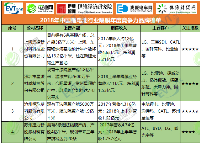 2018年中國鋰電池行業隔膜年度競爭力品牌榜單