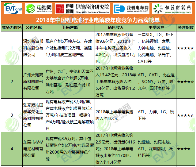 2018年中國鋰電池行業電解液年度競爭力品牌榜單