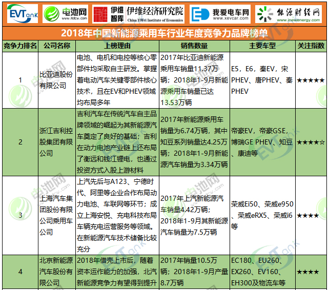 2018年中國新能源乘用車行業年度競爭力品牌榜單