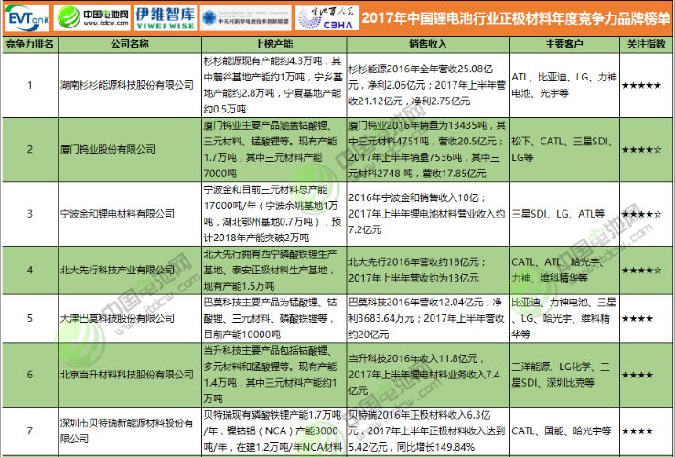 2017年中國鋰電池行業正極材料年度競爭力品牌榜單