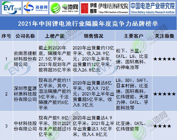 2021年中國(guó)鋰電池行業(yè)隔膜年度競(jìng)爭(zhēng)力品牌榜單