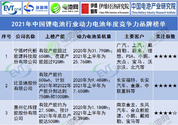 2021年中國(guó)鋰電池行業(yè)動(dòng)力電池年度競(jìng)爭(zhēng)力品牌榜單
