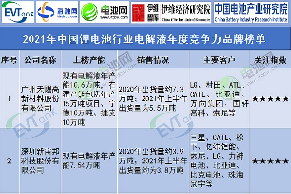 2021年中國(guó)鋰電池行業(yè)電解液年度競(jìng)爭(zhēng)力品牌榜單
