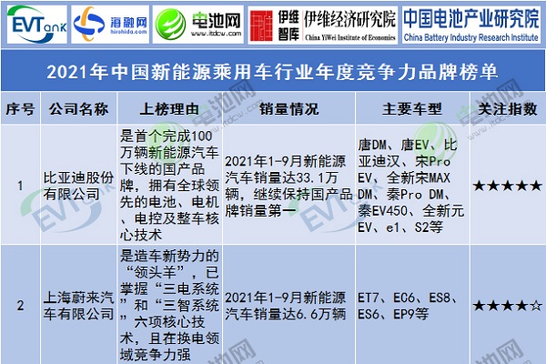 2021年中國(guó)新能源乘用車行業(yè)年度競(jìng)爭(zhēng)力品牌榜單