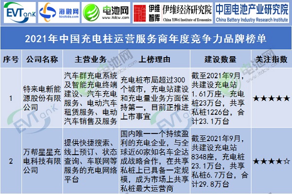 2021年中國(guó)充電樁運(yùn)營(yíng)服務(wù)商年度競(jìng)爭(zhēng)力品牌榜單