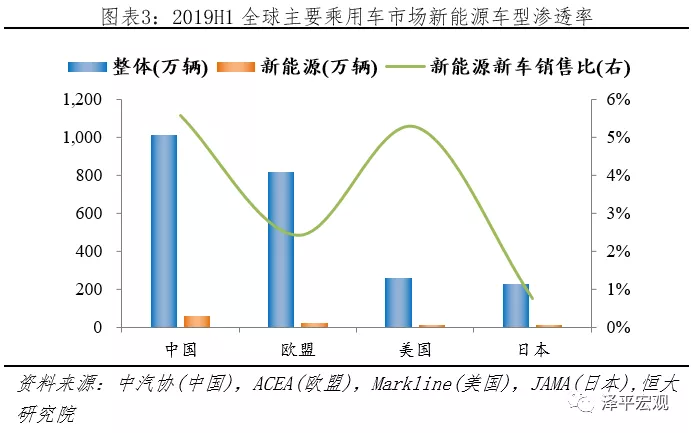 中國新能源乘用車滲透率最高,遠超歐盟、日本。據中汽協、ACEA、Markline等機構統計,2019H1中國、歐盟、美國、日本乘用車分別銷售1012.70、818.36、259.38、228.57萬輛;其中新能源乘用車分別銷售56.29、19.78、13.65、1.73萬輛,各占比57.19%、20.10%、13.87%、1.76%;對應新能源車型(EV+PHEV)滲透率分別為5.56%、2.42%、5.26%、0.76%。