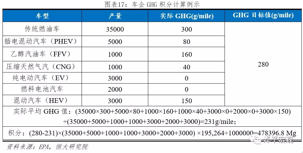 GHG標準采用積分制管理。EPA每年發布年度各車企GHG報告,對各車企積分進行公示,產生負積分的企業需要購買GHG正積分進行沖抵。GHG積分=(GHG目標值-GHG實際值)×產量×全生命周期里程÷1000000。其中全生命周期里程:乘用車為195264英里;積分單位:Mg(megagrams兆克)。假設:車企A年產50000輛乘用車,各車型產量分布如下,則計算可得該年實際積分為:478396.8Mg。