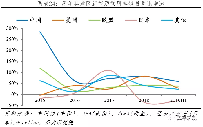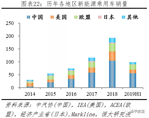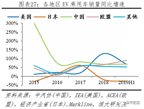 歐盟增速持穩,中、美增速下滑,日本持續負增長。據中汽協、IEA、ACEA等機構統計,2018年中國、美國、歐盟、日本、其它地區同比增速分別為81.9%、82.2%、42.2%、-34.4%、40.6%;2019H1中國、美國、歐盟、日本、其它地區同比增速分別為58.6%、27.9%、37.9%、-29.1%、23.1%。