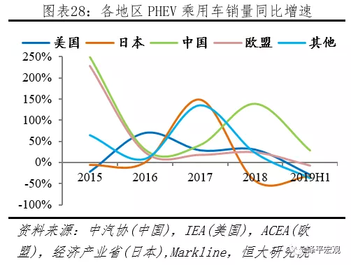 2019H1全球市場PHEV增速下滑,歐美EV、PHEV增速分化嚴重。2019H1新能源乘用車市場,據中汽協披露,中國EV、PHEV同比增速分別為69.9%、28.0%;據ACEA披露,歐盟EV、PHEV同比增速90.9%、-6.9%;據Markline披露,日本EV、PHEV同比增速-27.7%、-31.1%,美國EV、PHEV同比增速68.0%、-29.5%,其它地區EV、PHEV同比增速52.7%、-37.6%。按照上述統計,2019H1全球新能源乘用車市場,EV、PHEV同比增速分別為68.7%、-0.8%。