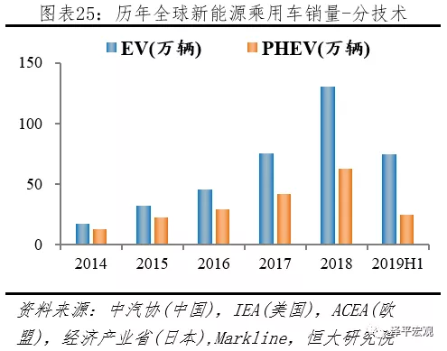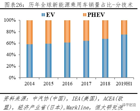 2019H1全球新能源乘用車市場EV占比3/4,份額持續提升。2019H1新能源乘用車市場,據中汽協披露,中國EV、PHEV分別銷售44.0、12.3萬輛;據ACEA披露,歐盟EV、PHEV分別銷售12.5、7.2萬輛;據Markline披露,美國EV、PHEV分別銷售10.6、3.1萬輛,日本EV、PHEV分別銷售1.1、0.7萬輛,其它地區EV、PHEV分別銷售6.2、1.2萬輛。按上述統計,2019H1全球新能源乘用車市場,EV、PHEV分別銷售74.4、24.6萬輛;EV市場份額從2014年58.4%提升到2019上半年75.2%。