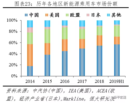 2019H1新能源乘用車全球份額,中國五成、歐盟兩成、美日共兩成。據中汽協披露,2018、2019H1中國新能源乘用車分別銷售105.3、56.3萬輛;據IEA、Markline披露,2018、2019H1美國新能源乘用車分別銷售36.1、13.7萬輛;據ACEA披露,2018、2019H1歐盟新能源乘用車分別銷售30.2、19.8萬輛;據經濟產業省、Markline披露,2018、2019H1日本新能源乘用車分別銷售18.4、7.4萬輛;據IEA、Markline披露,2018、2019H1其它地區新能源乘用車分別銷售18.4、7.4萬輛。按照上述統計, 2019H1中國、美國、歐盟、日本、其它地區新能源乘用車市場份額分別為56.9%、13.8%、20.0%、1.8%、7.5%。