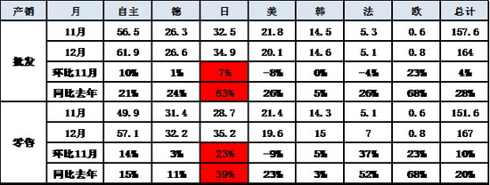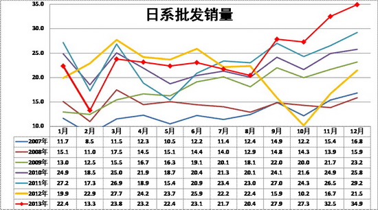 13年1-8月的日系銷量仍處于弱于2011年前的低位水平,但今年3月以來的逐月走勢有不斷穩步走強的趨勢,而到9-12月因為新車等的促進而銷量暴增,歷年的11月最好也就是與3月相近,但今年11月較3月增長15%,且12月仍維持高增長的局面。日系的12月走勢體現新品和企業目標突破的努力,效果較好。